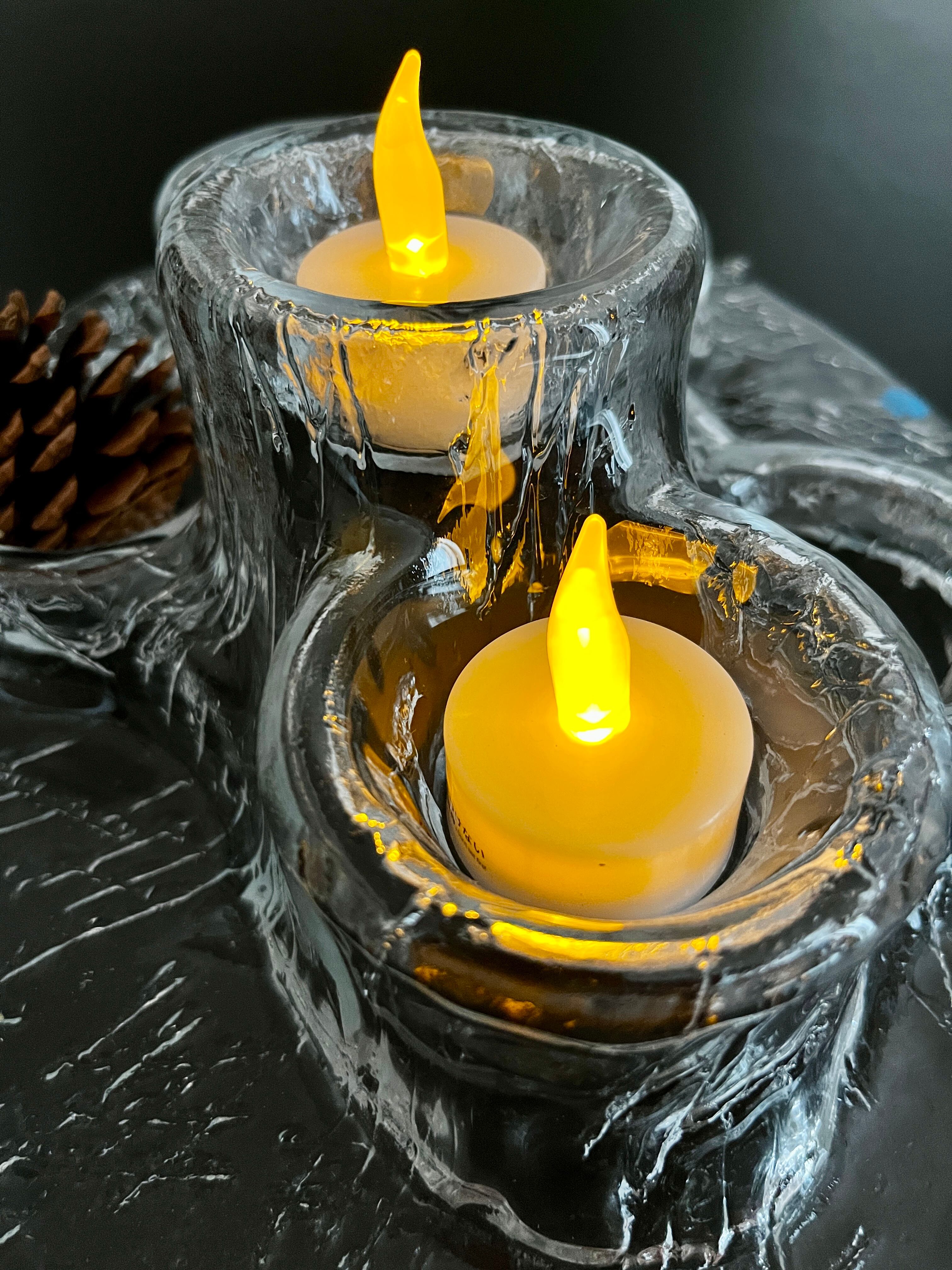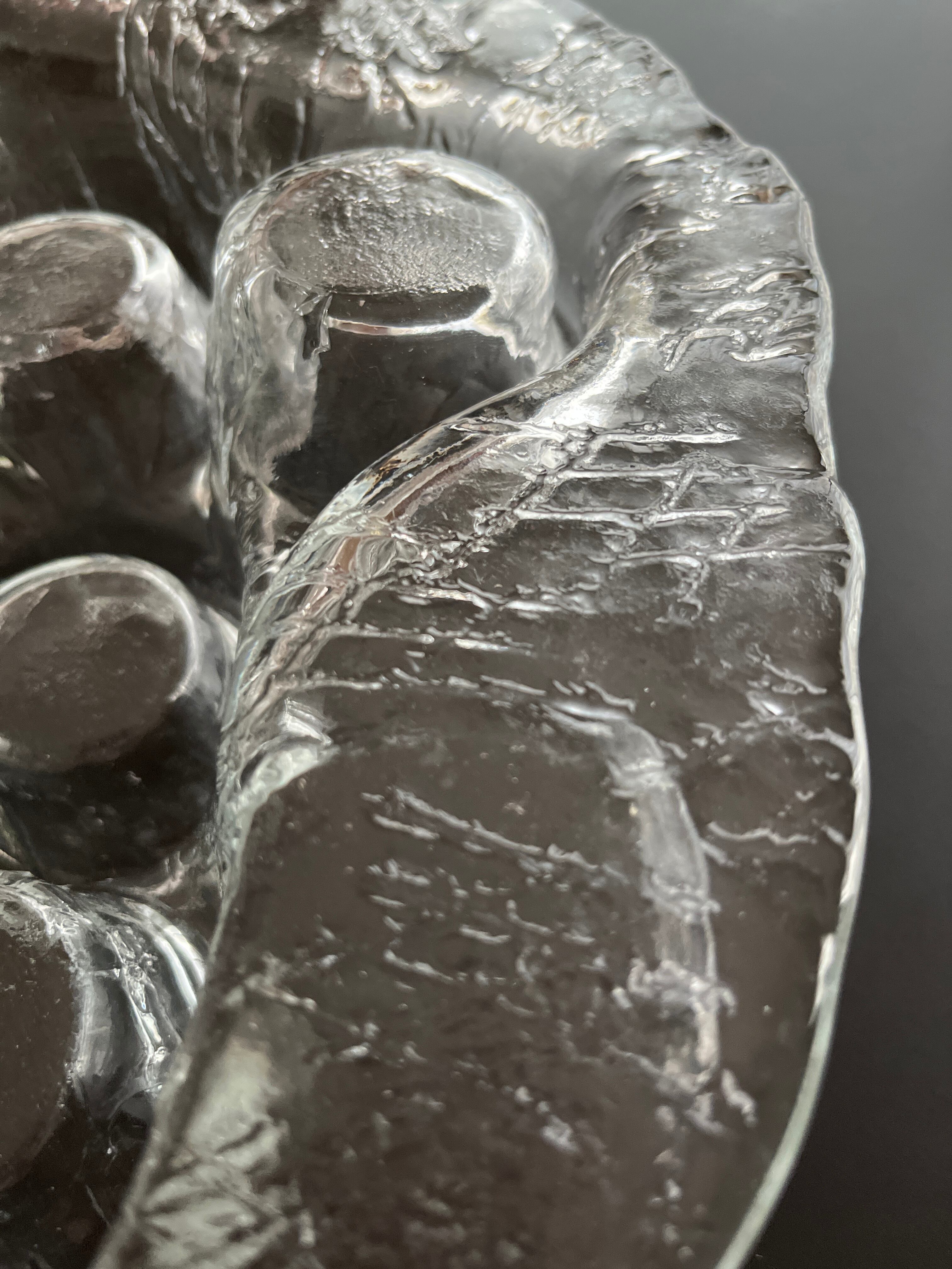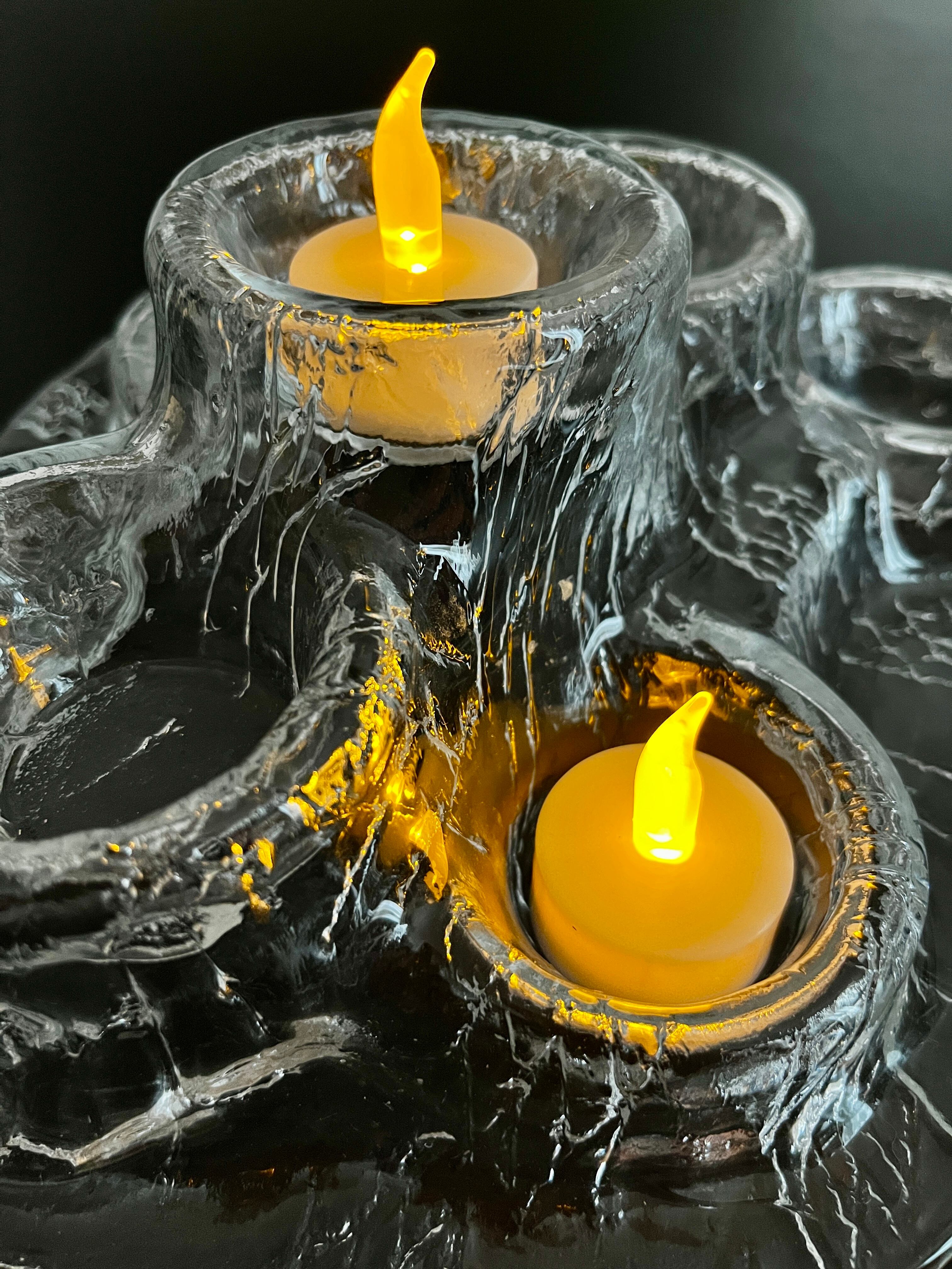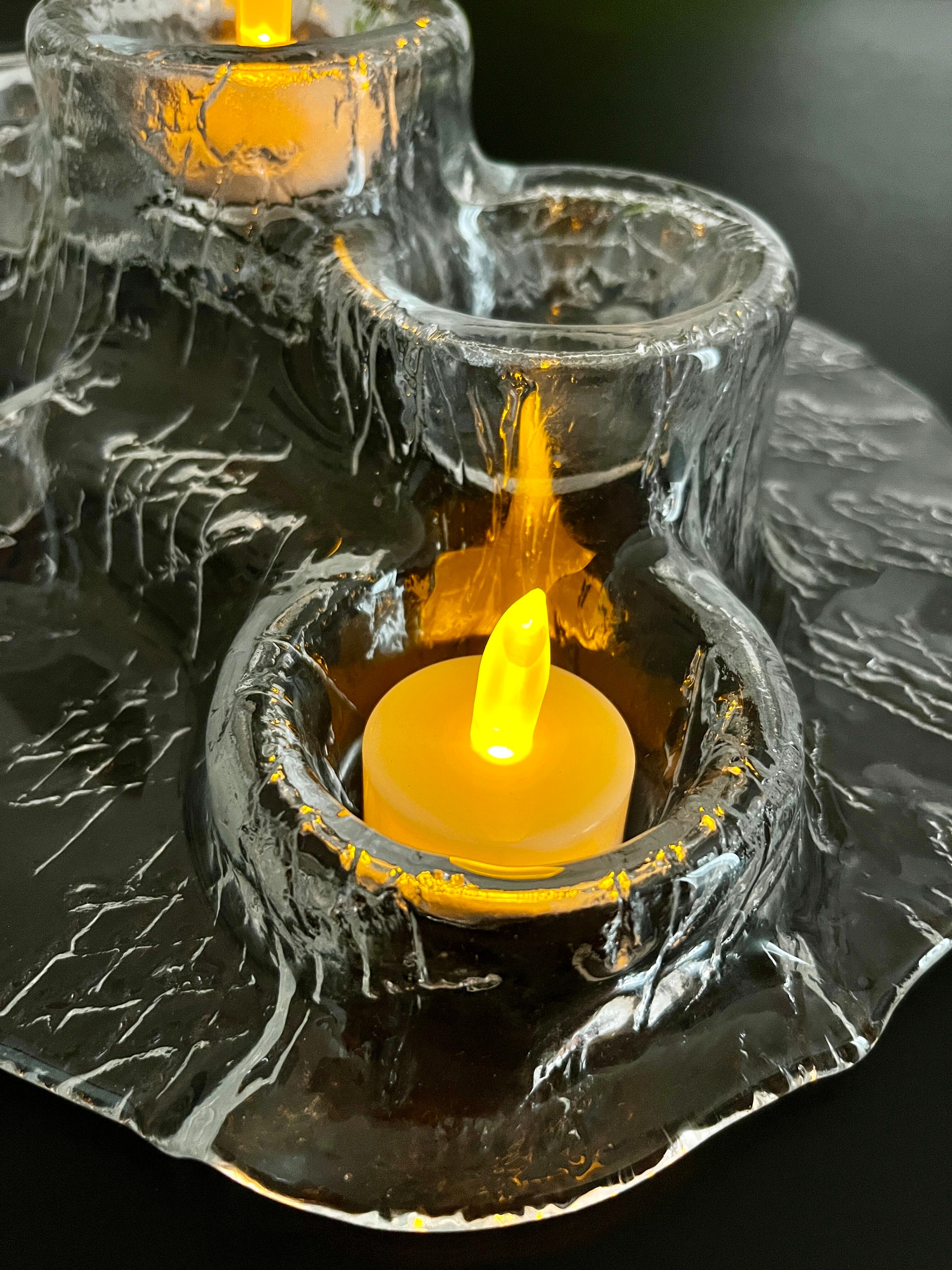 溶岩が流れる火山を模したフォルムで、氷のような質感のガラスが特徴の、ハンドメイドアートガラスのキャンドルホルダです。